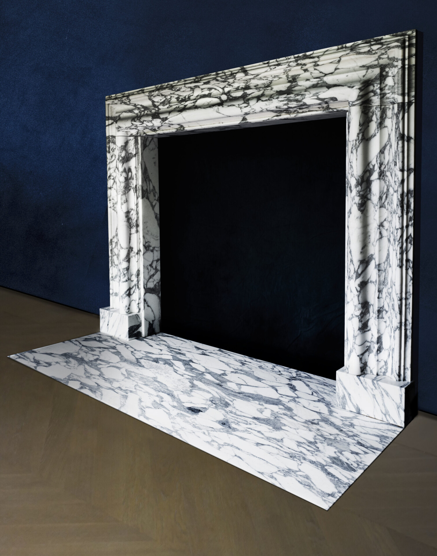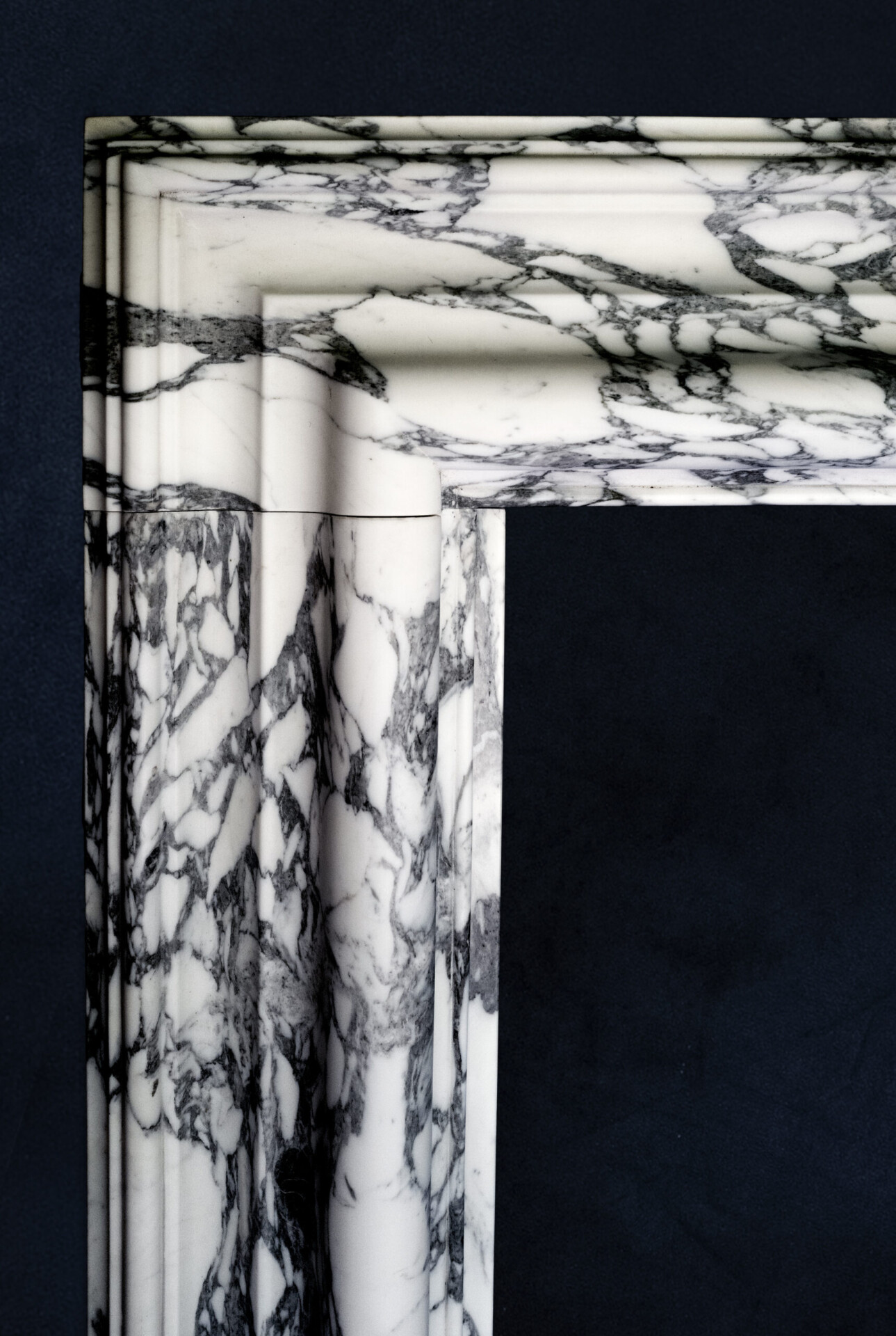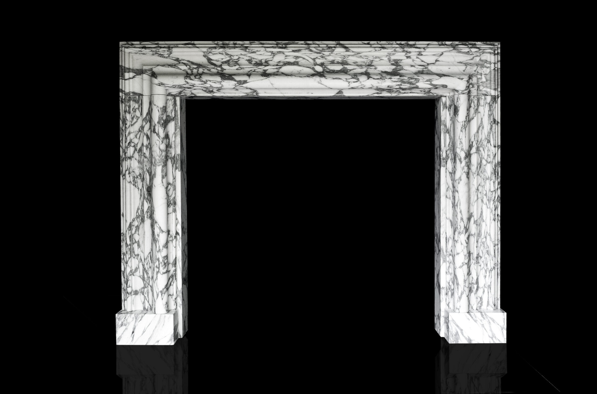 A modern copy of a William III, Queen Anne, or George I period veined statuary marble bolection, or swelling mould chimney-piece. The marble is precisely copied from an antique original and is supplied with a set of internal slips and matching veined white marble slab or hearth.