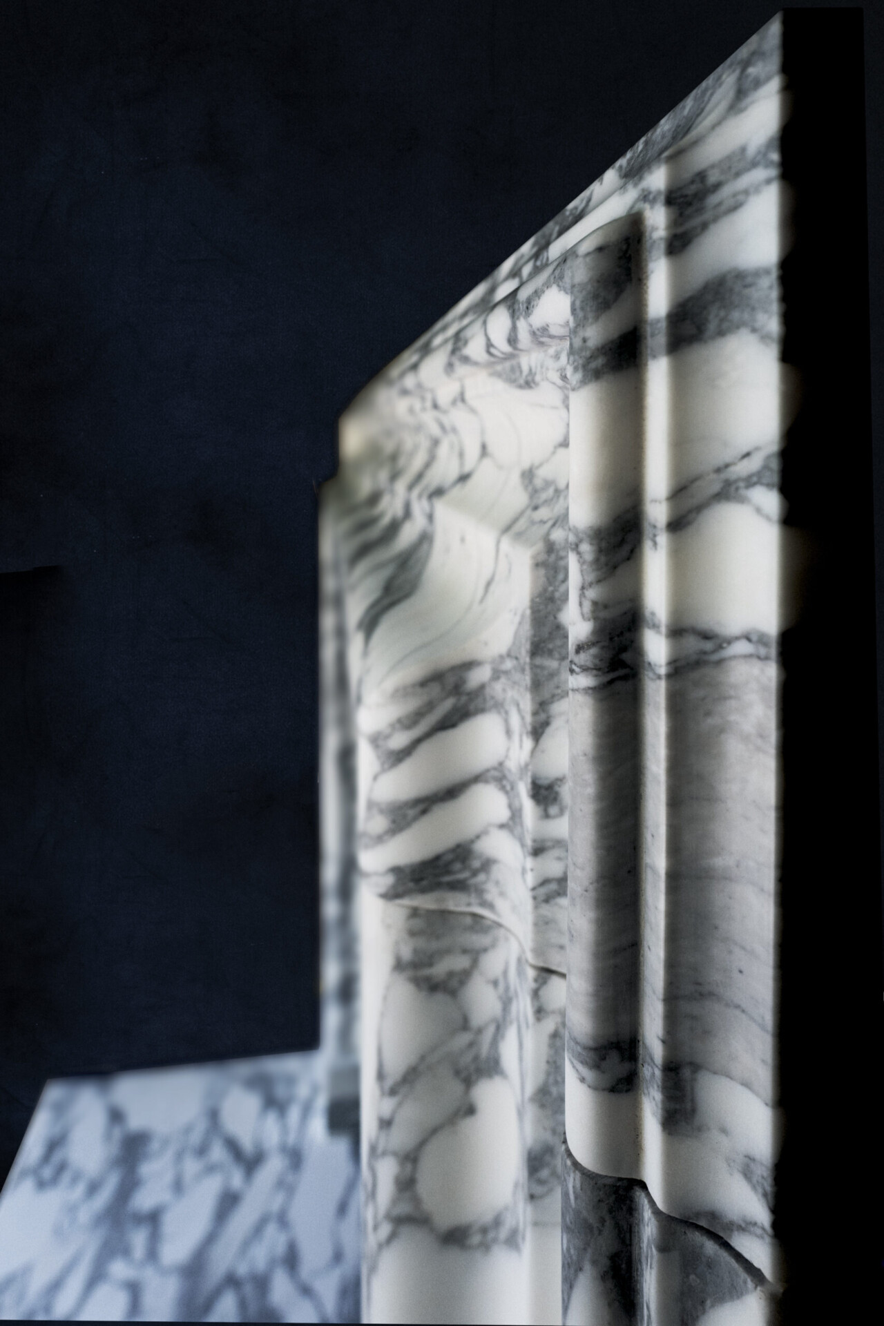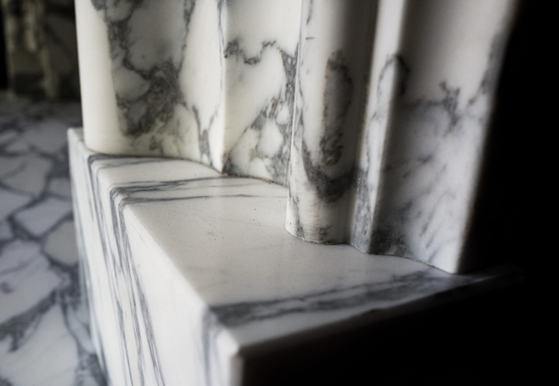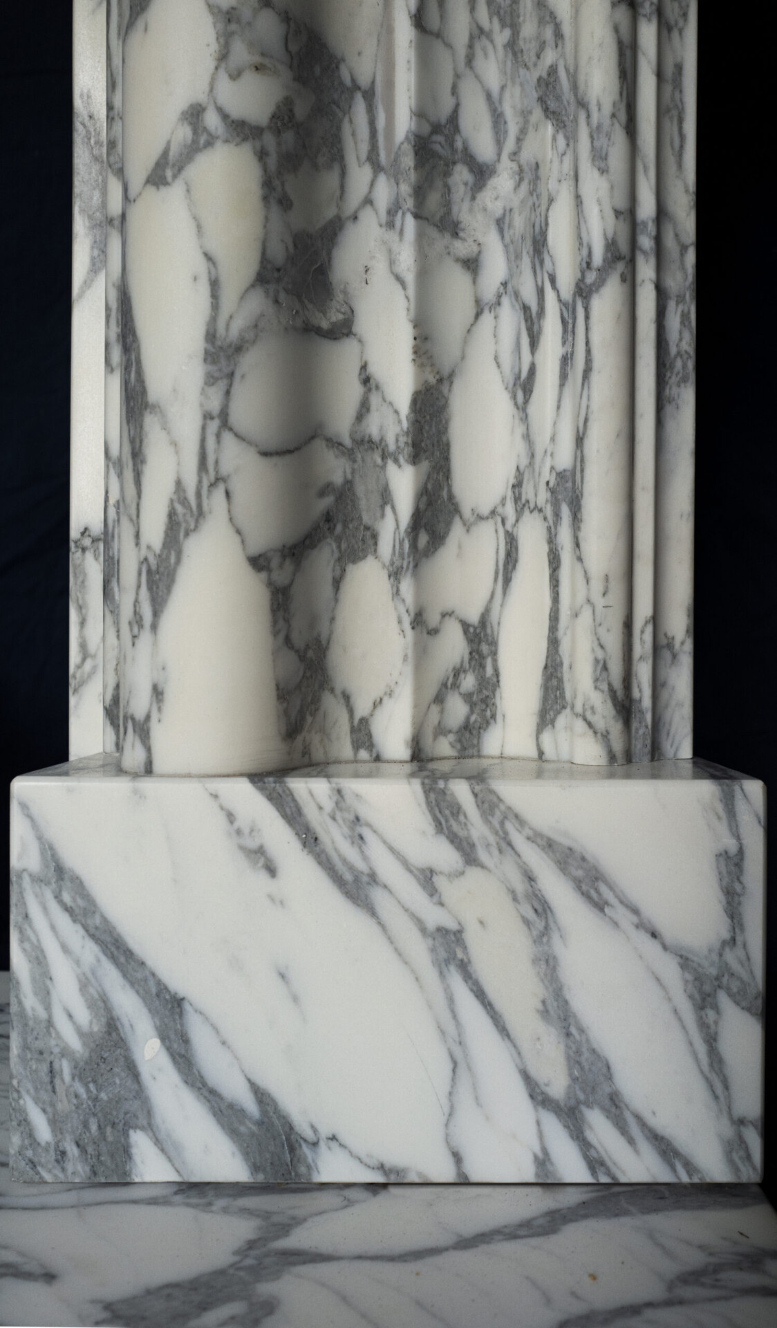 A modern copy of a William III, Queen Anne, or George I period veined statuary marble bolection, or swelling mould chimney-piece. The marble is precisely copied from an antique original and is supplied with a set of internal slips and matching veined white marble slab or hearth.
